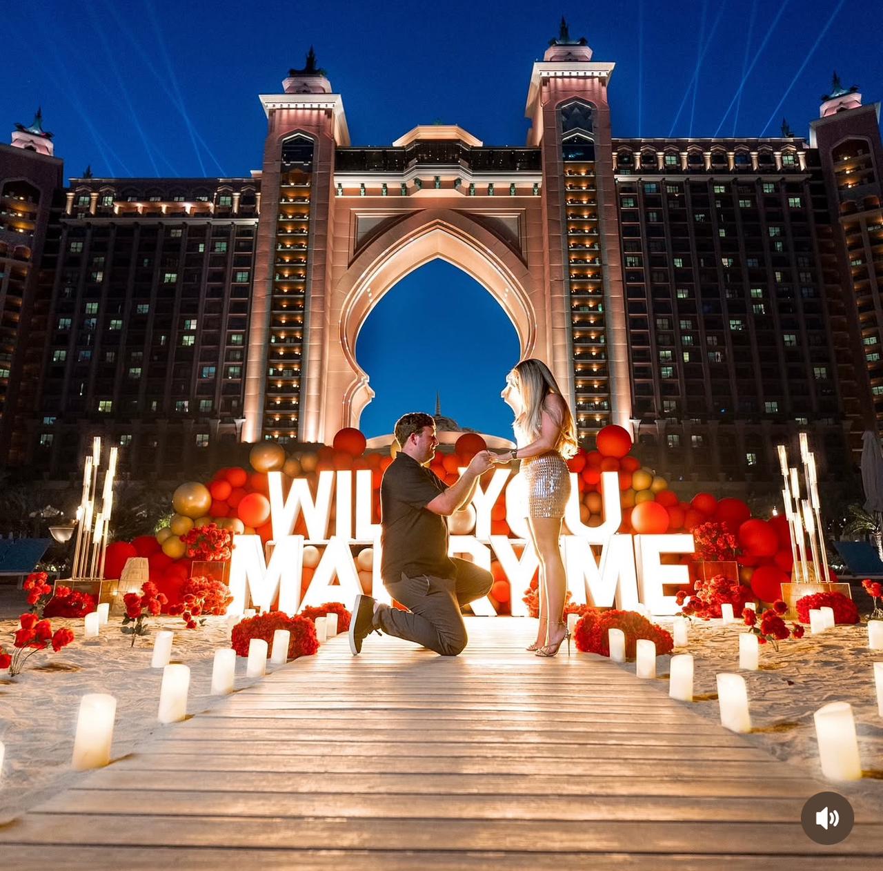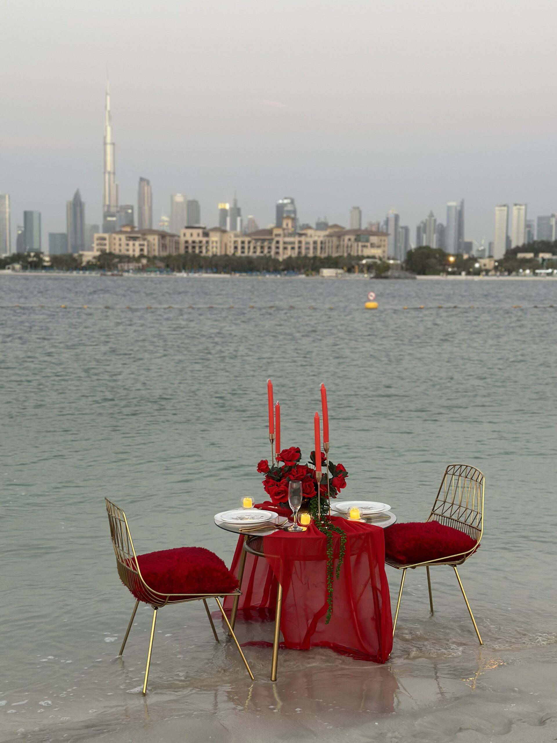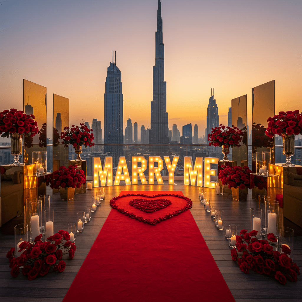 Private rooftop dinner with Burj Khalifa view, red carpet, “Marry Me” marquee letters, rose petal pathway, romantic setup for two with fresh rose centerpiece, private waiter, and a delicious 3-course meal.