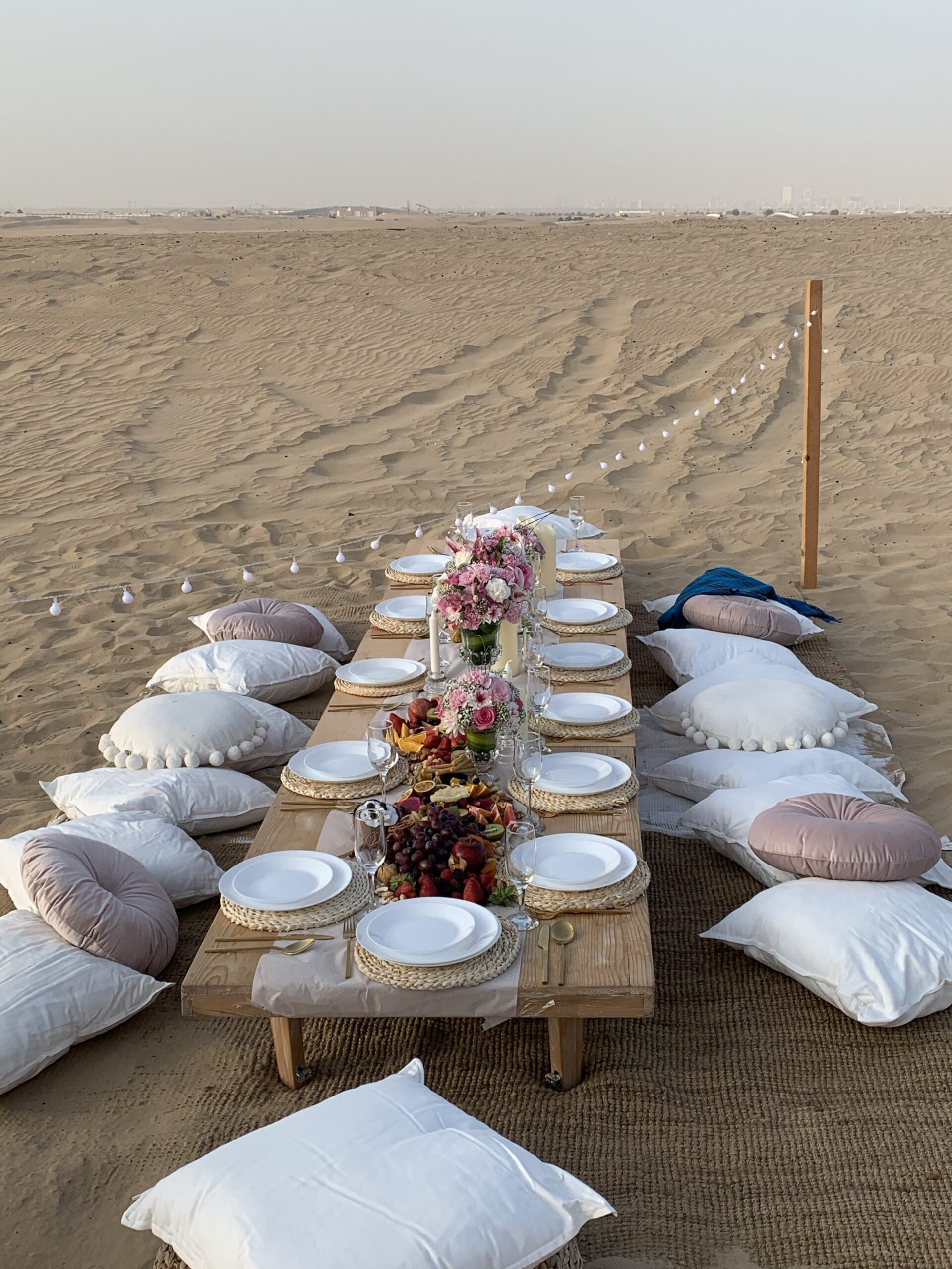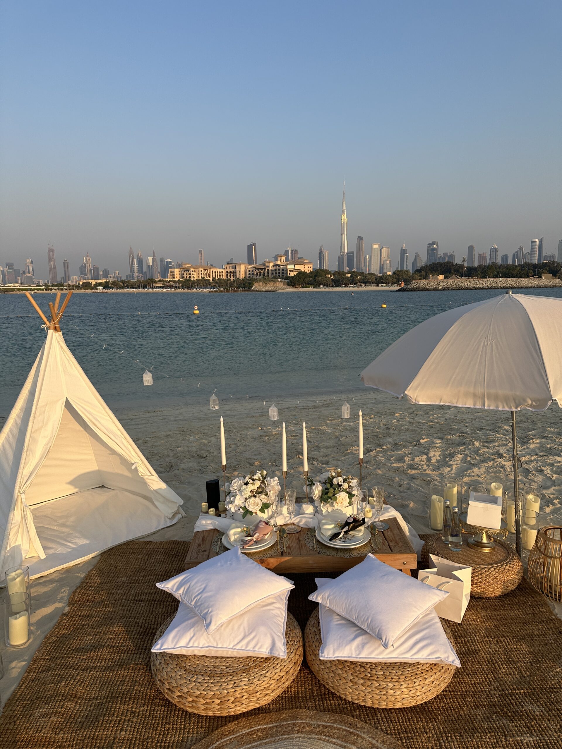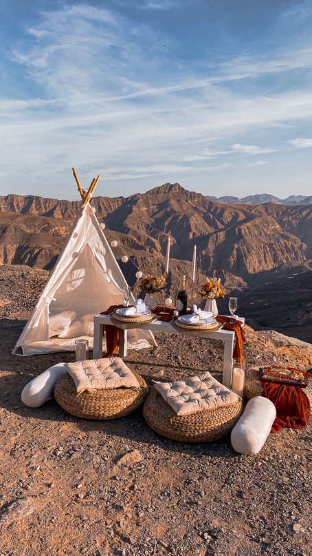Romantic date setup for two at UAE’s highest peak, featuring a floral centerpiece, cozy cushions, candlelit décor, elegant place settings , a lit teepee tent, a sweet & savory charcuterie board, and non-alcoholic champagne.