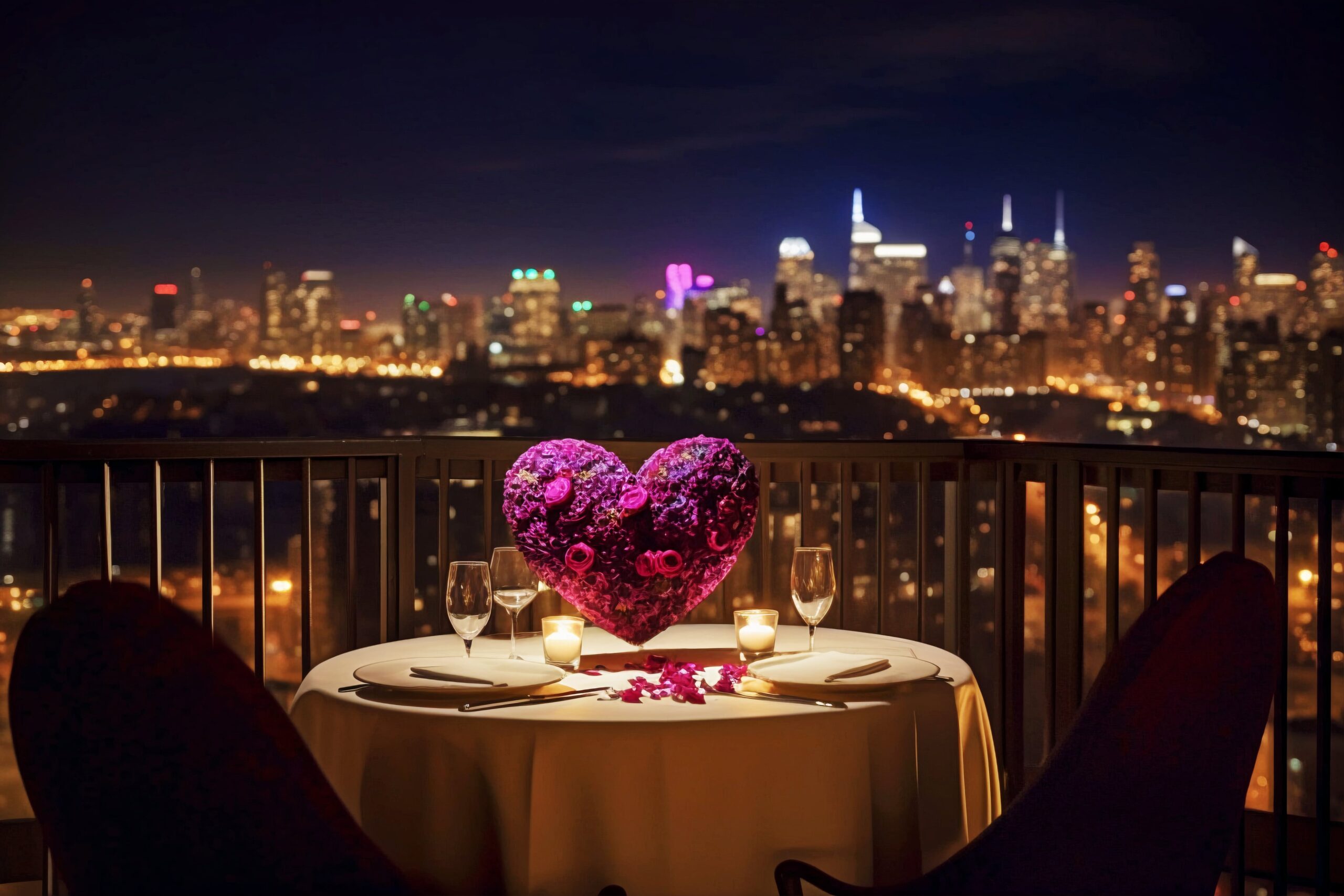 Private rooftop experience with a stunning Burj Khalifa view, red carpet entrance, rose petal path and heart, romantic dinner setup for two with a fresh rose centerpiece, private waiter, and a delicious 3-course meal.