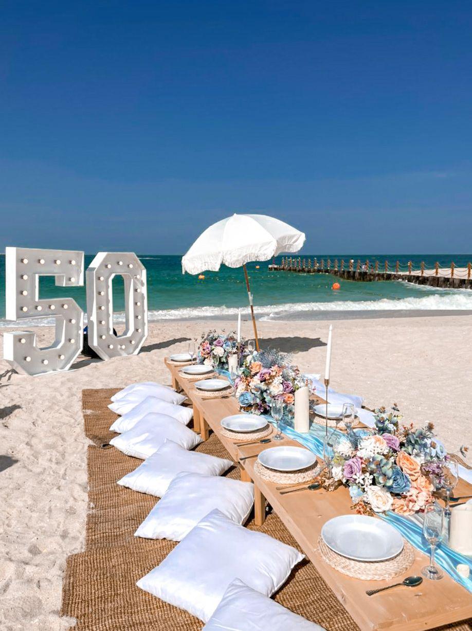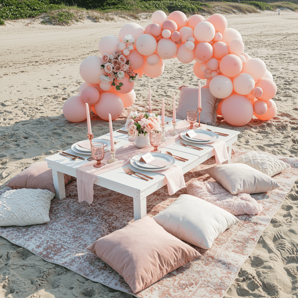 Romantic beach proposal with fresh rose garden, centerpiece, cushions, candles, and tablescaping. Includes full place settings, heart-shaped proposal backdrop and dinner with soft drinks.