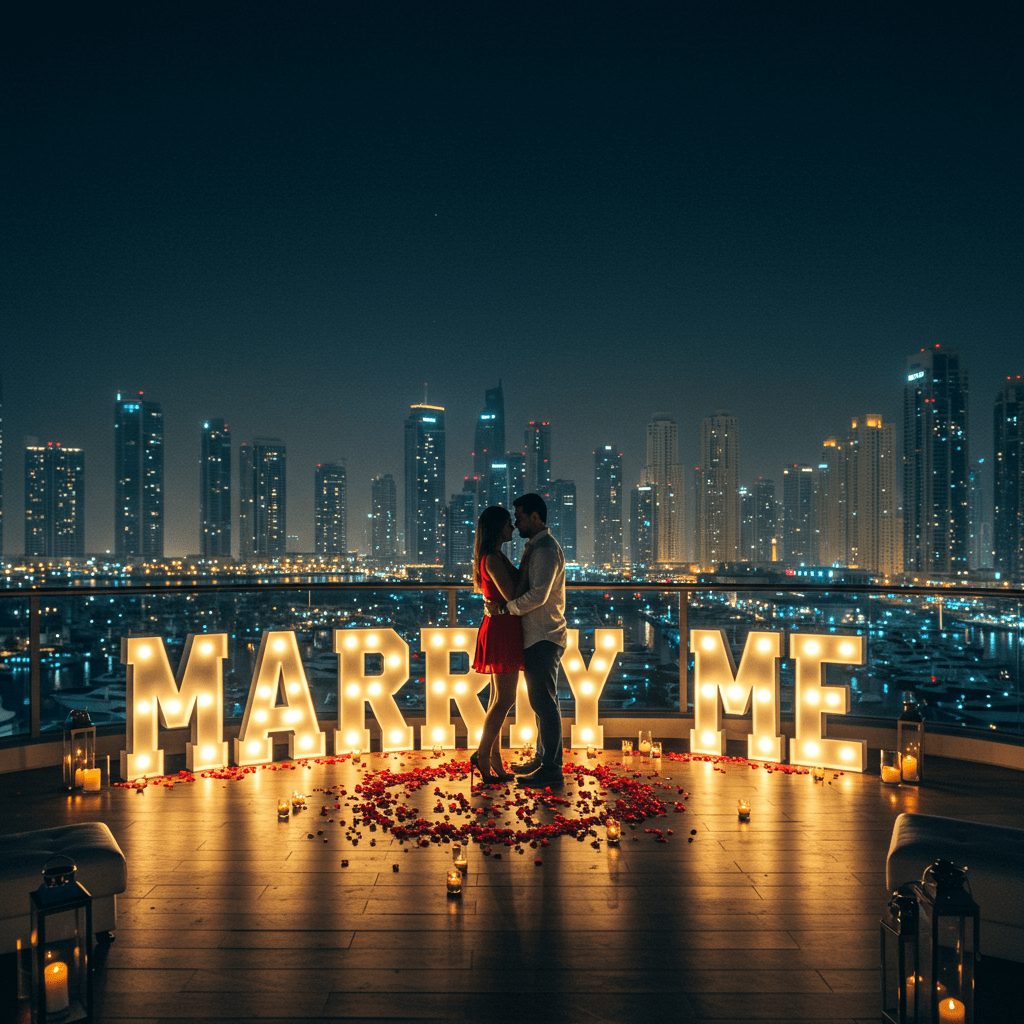 A beautifully decorated rooftop restaurant overlooking the stunning views of Palm Jumeirah, featuring a romantic dinner setup for two. The scene is set with an elegant floral centerpiece, glowing ‘Marry Me’ marquee letters, a charming rose petal pathway, and a candlelit ambiance. Enjoy a memorable evening with delicious gourmet dinner and drinks as the city lights and the shimmering waters of Palm Jumeirah create the perfect backdrop for your special moment.