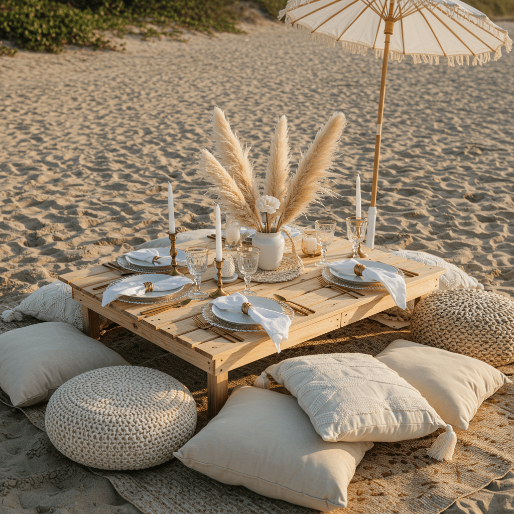 Fresh Floral Vibrant picnic setup with rugs, cushions, table runners, candles, custom flower centerpieces, full place settings, boho umbrella with lights, personalized welcome sign, custom place cards — includes transport, setup, and cleanup.